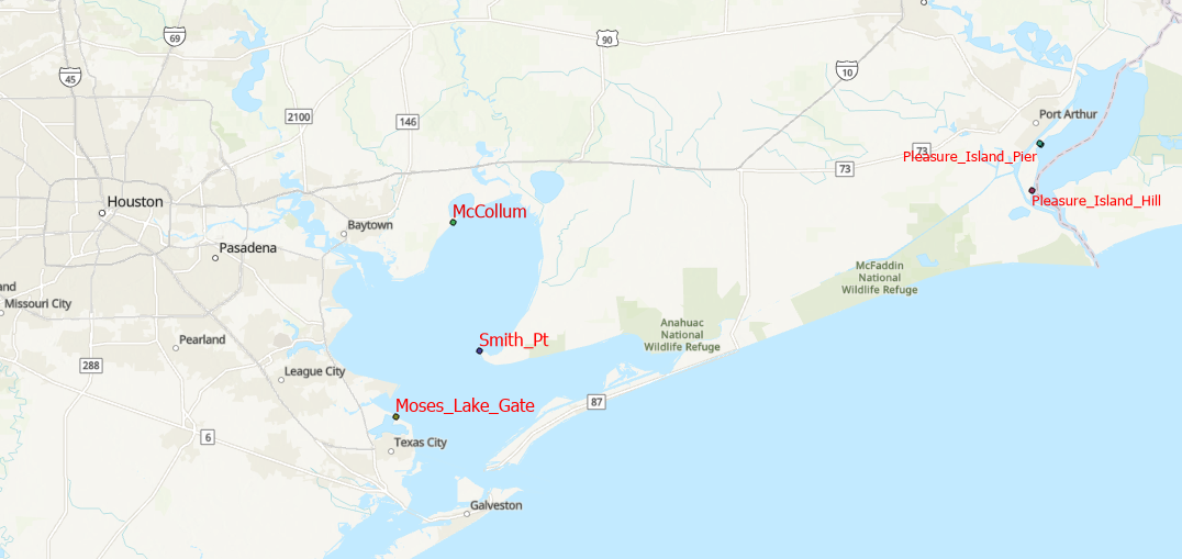 This map shows the locations of the radar networks on both Galveston Bay on the left side of the map and Pleasure Island on the right side of the map.